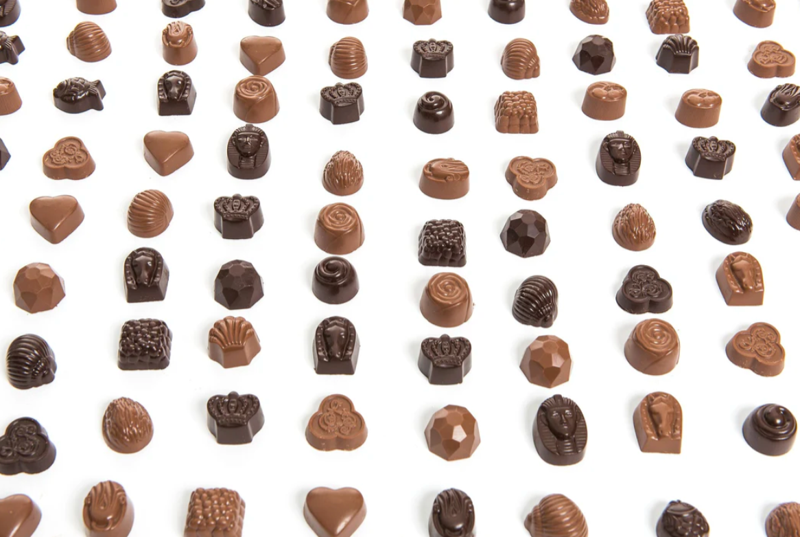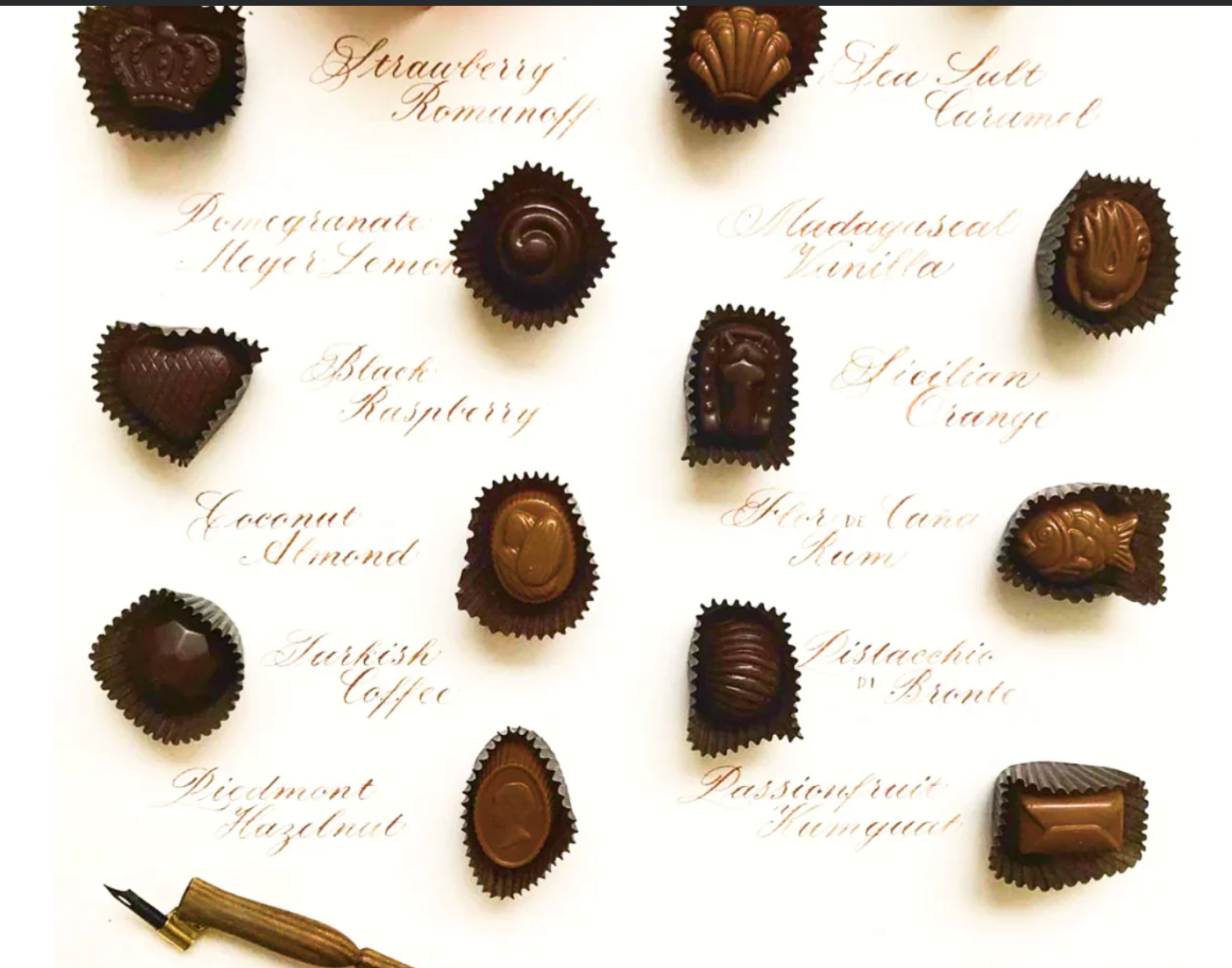 Strawberry Romanoff Madagascar Vanilla Pomegranate Meyer Lemon Turkish Coffee Pistachio di Bronte Sicilian Orange Coconut Almond Passion Fruit Kumquat Sea Salt Caramel Flor de Cana Rum Piedmont Hazelnut Black Raspberry Sherry’s Trefoil 72% Sherry’s Trefoil Milk